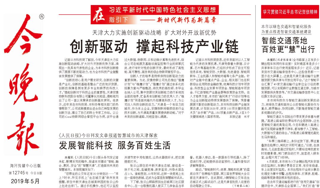 近日,天津今年会jinnianhui物联科技股份有限公司登上《今晚报》头版头条,以下为相关内容: